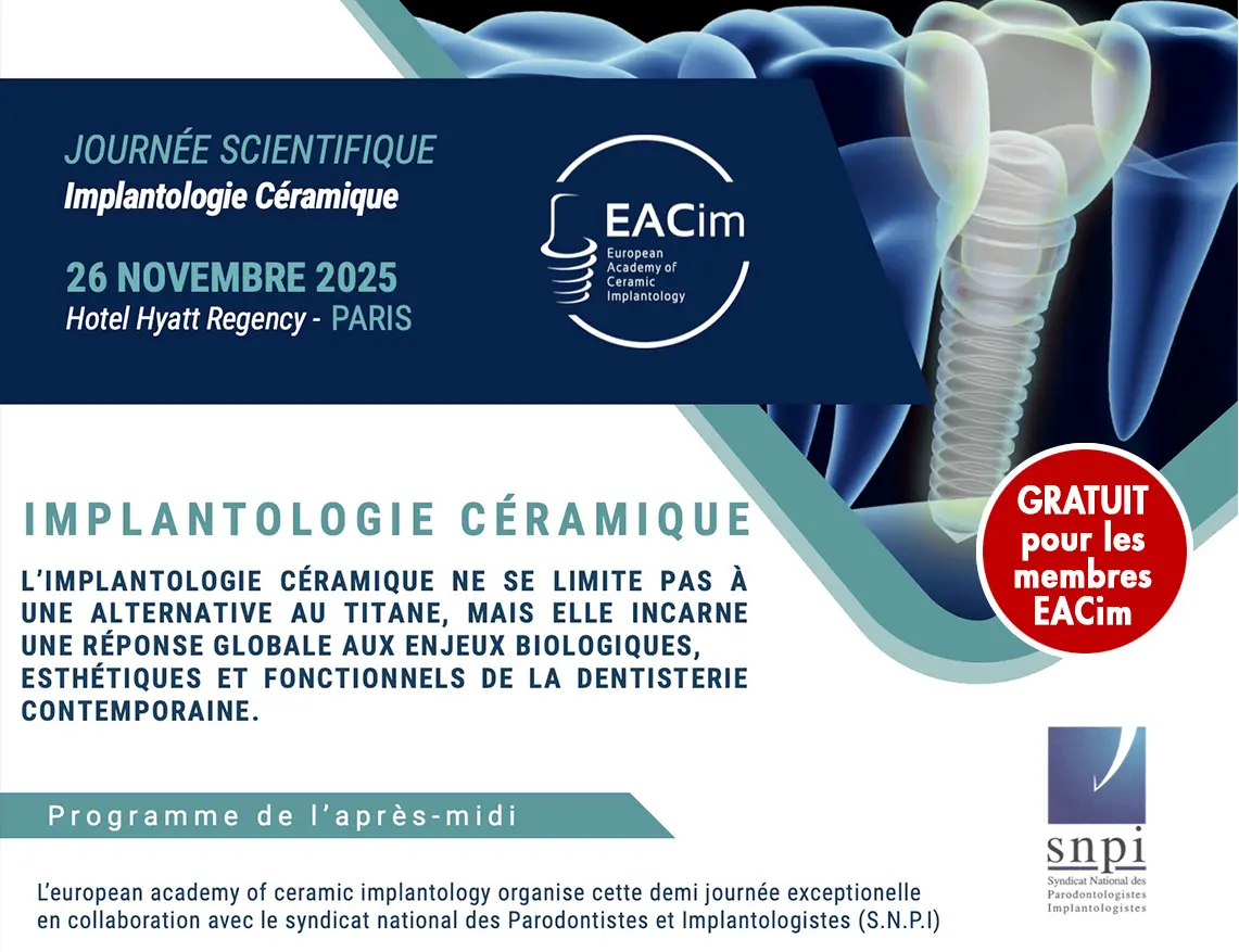 Inscriptions : https://eacim-ceramic-implantology.com/fr/event/journee-scientifique-sur-limplantologie-ceramique-eacim-snpi-a-paris-26-novembre-2025/