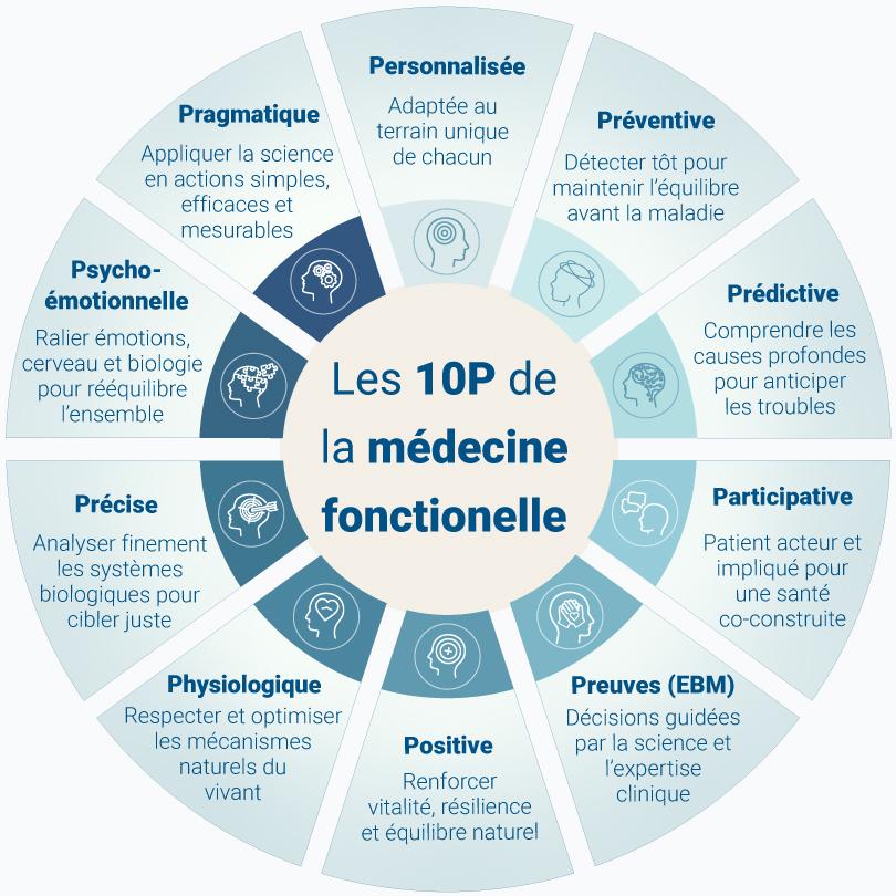 La médecine fonctionnelle est basée sur les “10 P”, elle combine science, prévention, personnalisation et implication du patient pour une approche systémique et durable de la santé.